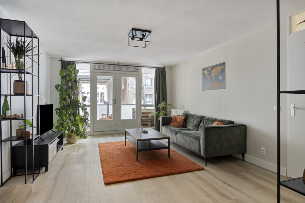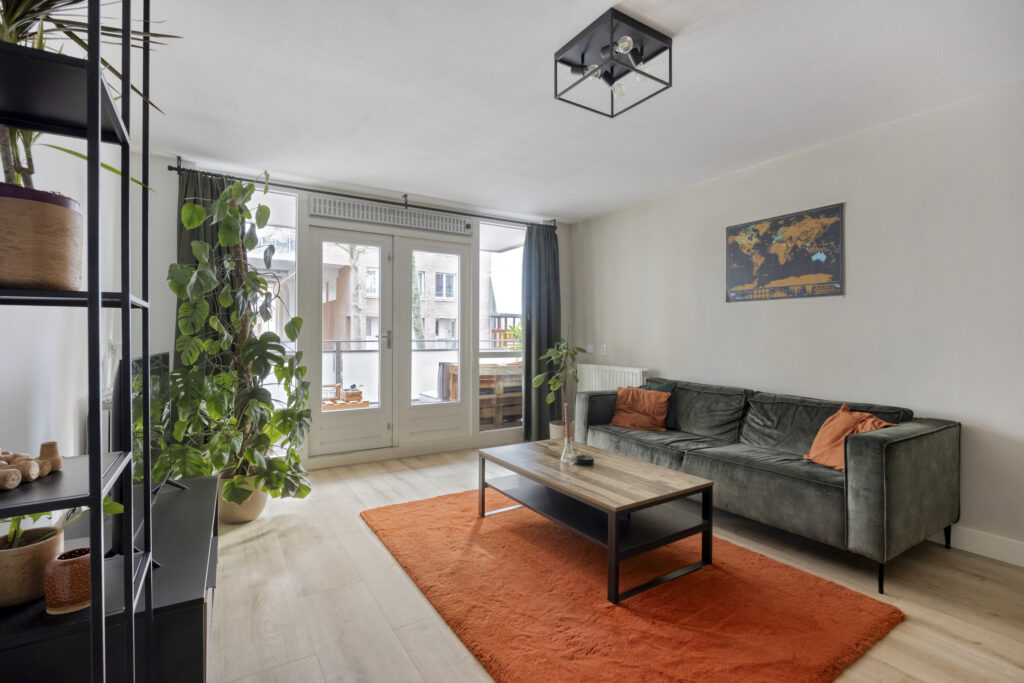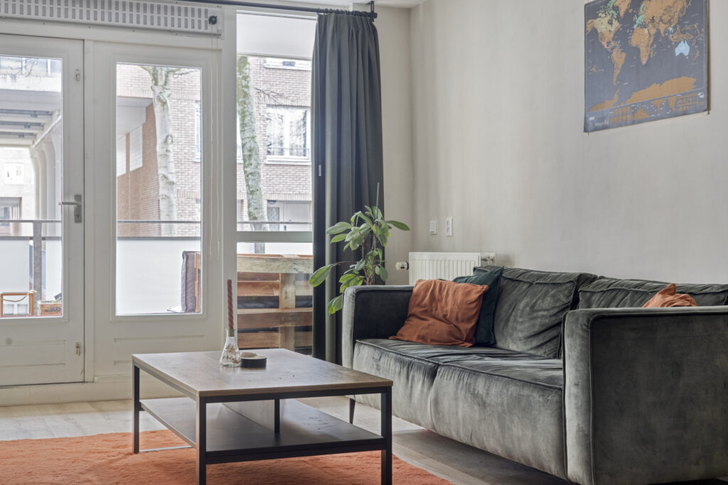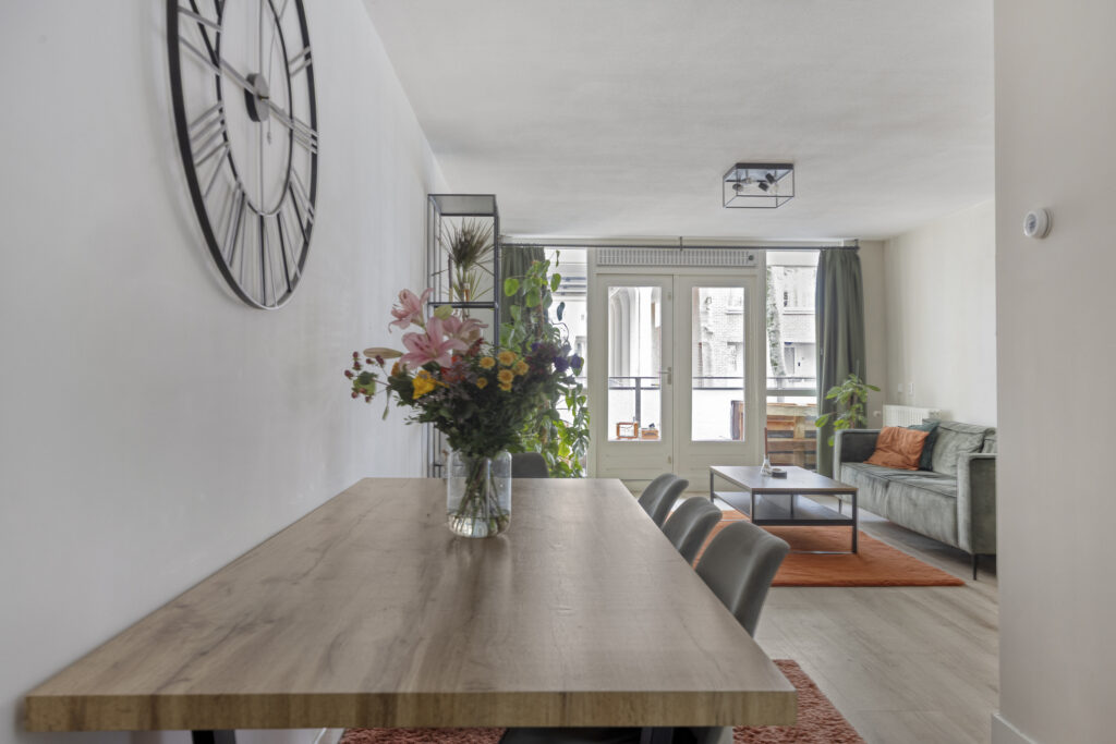 Aan het einde van de hal loop je de bijna 10 meter lange woonkamer in, met lichtinval aan de voor- en achterzijde. De mooie kleuren op de muren passen bij verschillende interieurstijlen en is er genoeg plek voor een grote zithoek, tv-meubel, eettafel en een dressoir. Nodigen vrienden en familie maar uit voor een avondje Netflixen, een etentje op een spelletjesavond want dit appartement is heerlijk ruim!