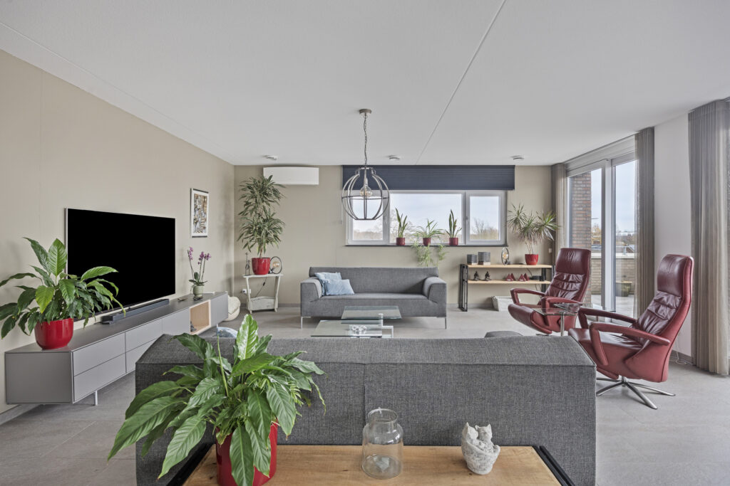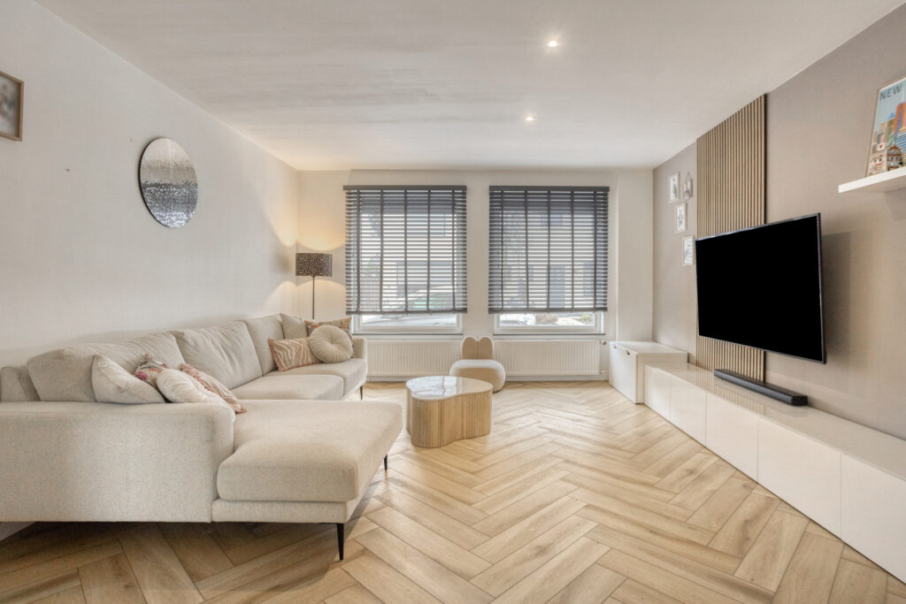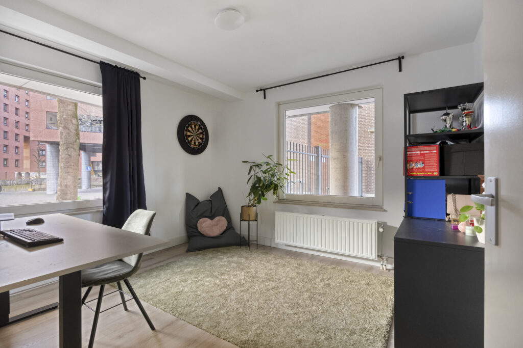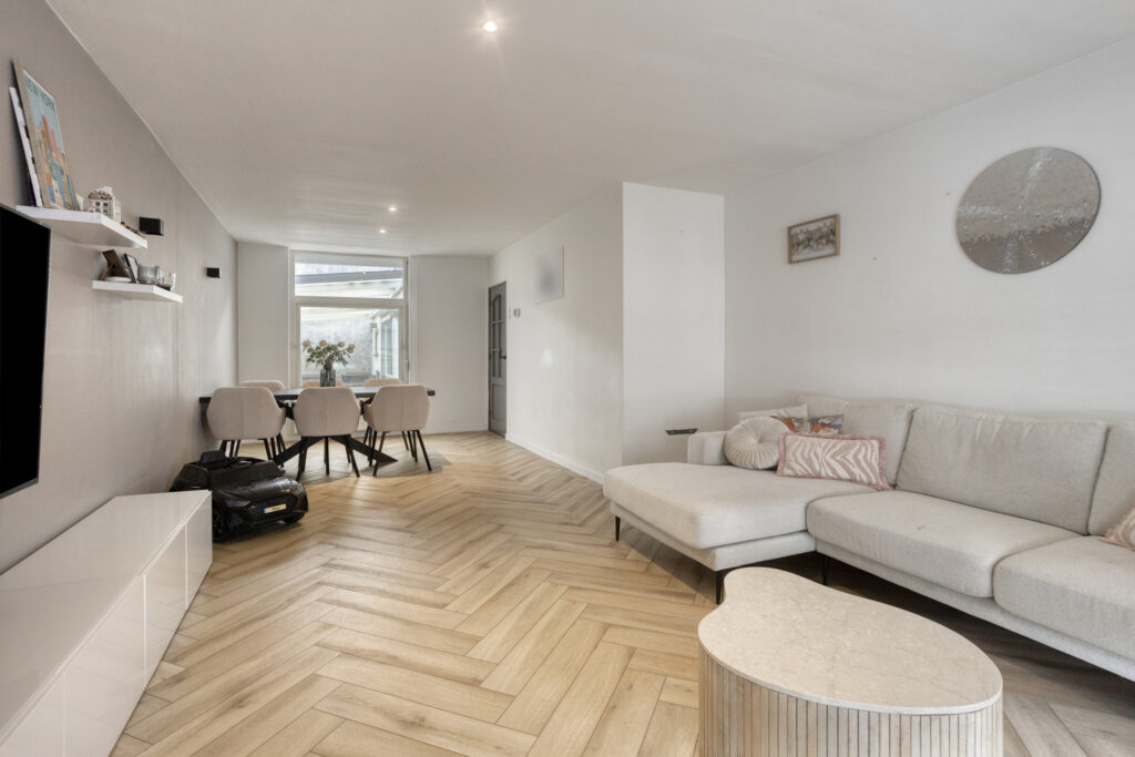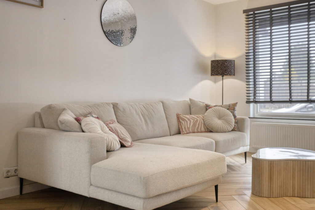 Aan het einde van de hal loop je de bijna 10 meter lange woonkamer in, met lichtinval aan de voor- en achterzijde. De mooie kleuren op de muren passen bij verschillende interieurstijlen en is er genoeg plek voor een grote zithoek, tv-meubel, eettafel en een dressoir. Nodigen vrienden en familie maar uit voor een avondje Netflixen, een etentje op een spelletjesavond want dit appartement is heerlijk ruim!