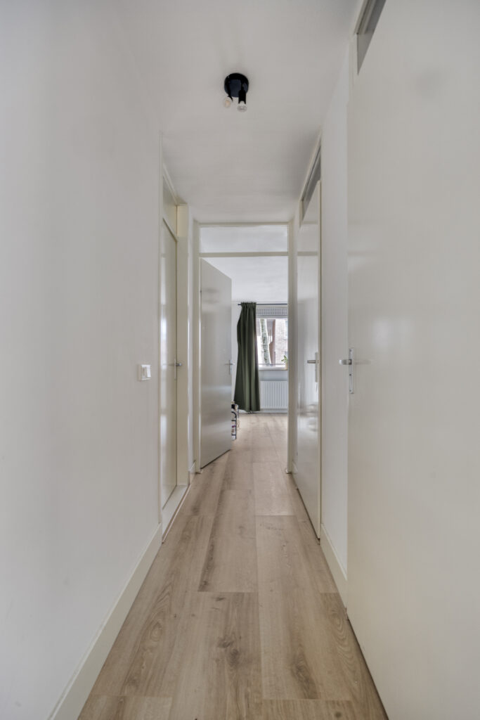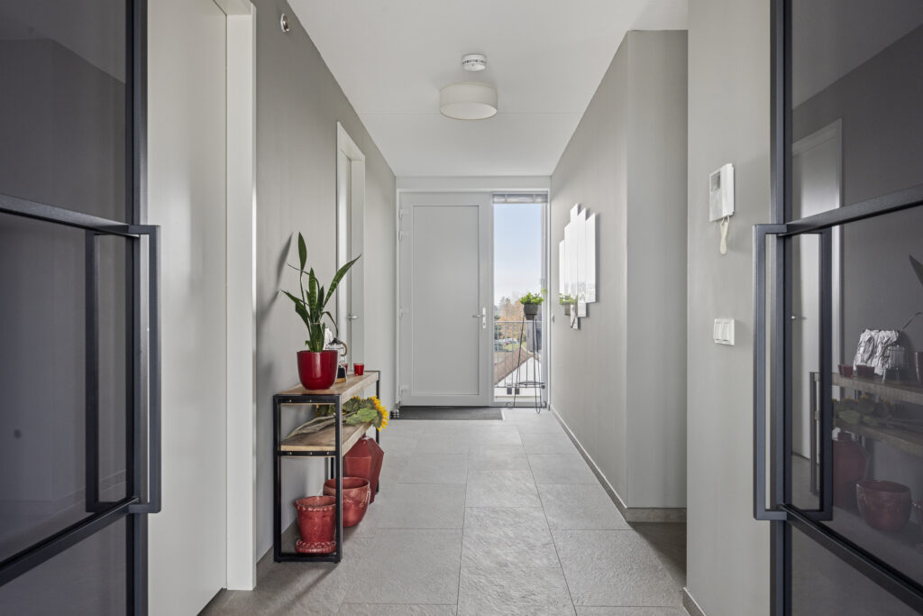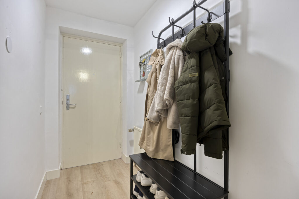 Achter de voordeur is de hal die, net als de rest van het appartement, er supernetjes uit ziet. Op de vloer ligt laminaat en de binnendeuren met kozijnen zijn zwart geschilderd. In de hal hangt de video-intercom, waardoor je kunt horen en zien wie aanbelt.