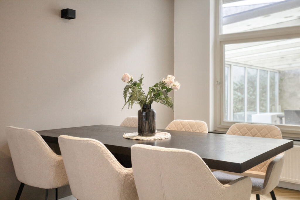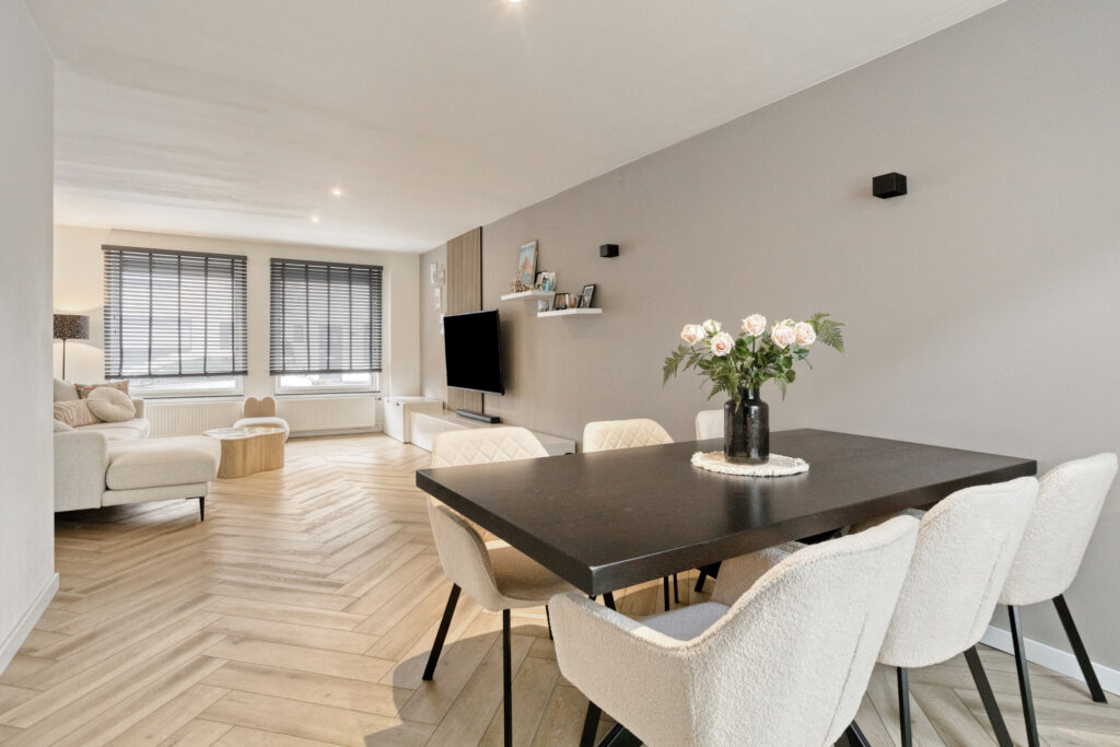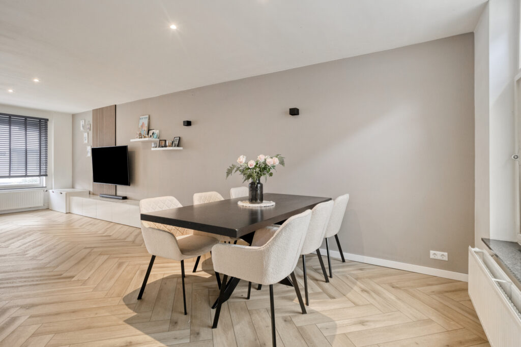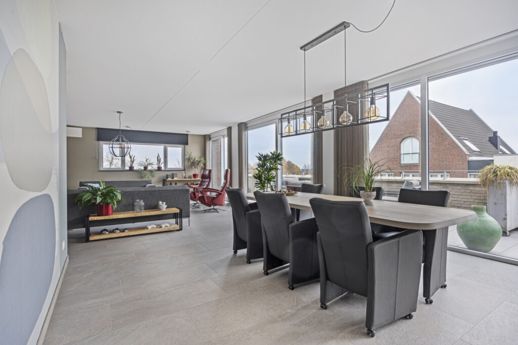 De woon-/eetkamer is het toonbeeld van luxe en stijl. Stucwerk, inbouwverlichting, aansluitingen voor wandverlichting en een visgraatvloer bepalen de sfeer. Het zitgedeelte is aan de voorzijde en het eetgedeelte, met genoeg plek voor een 6-persoonstafel, is aan de achterzijde.