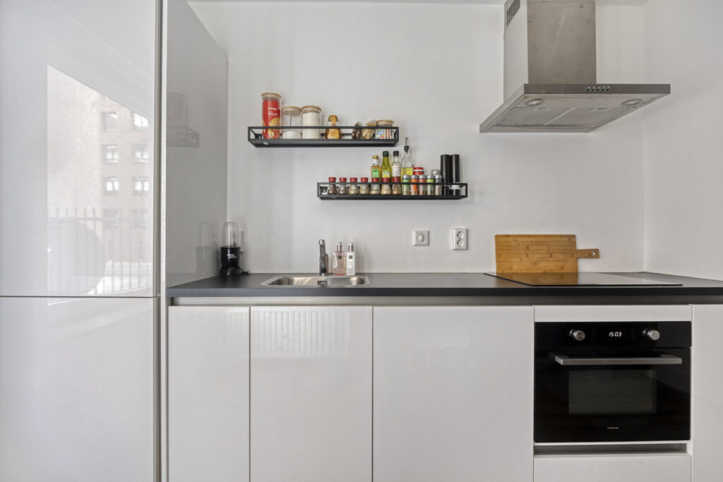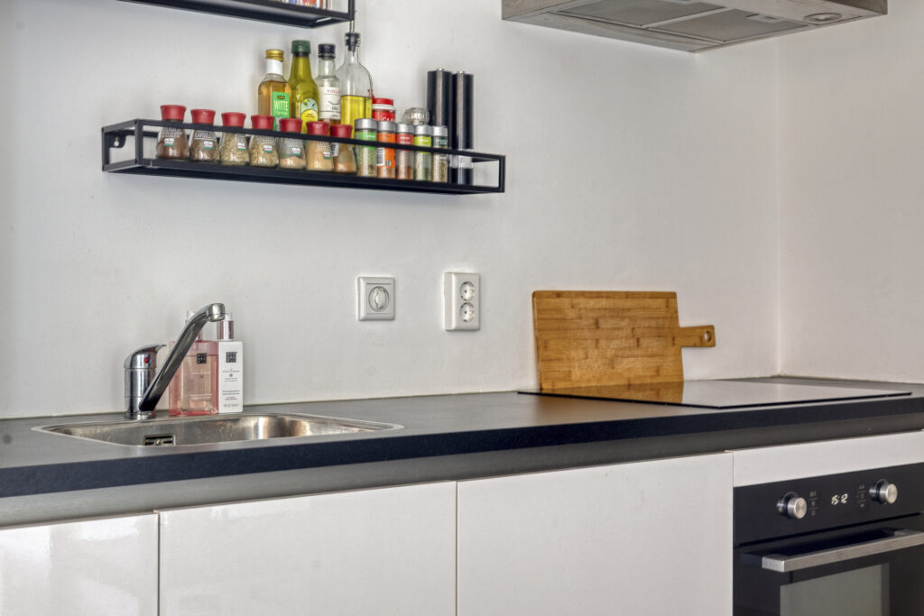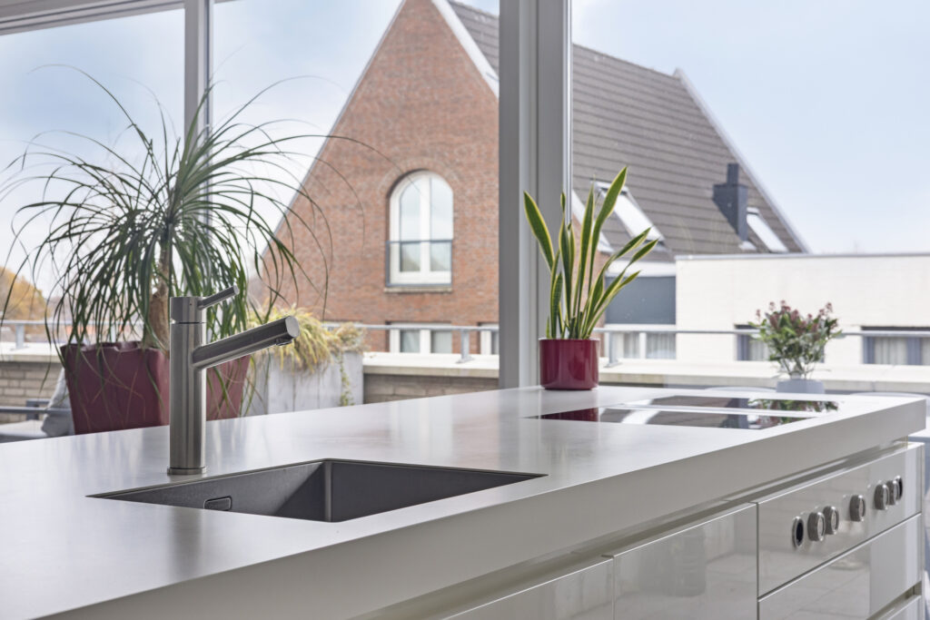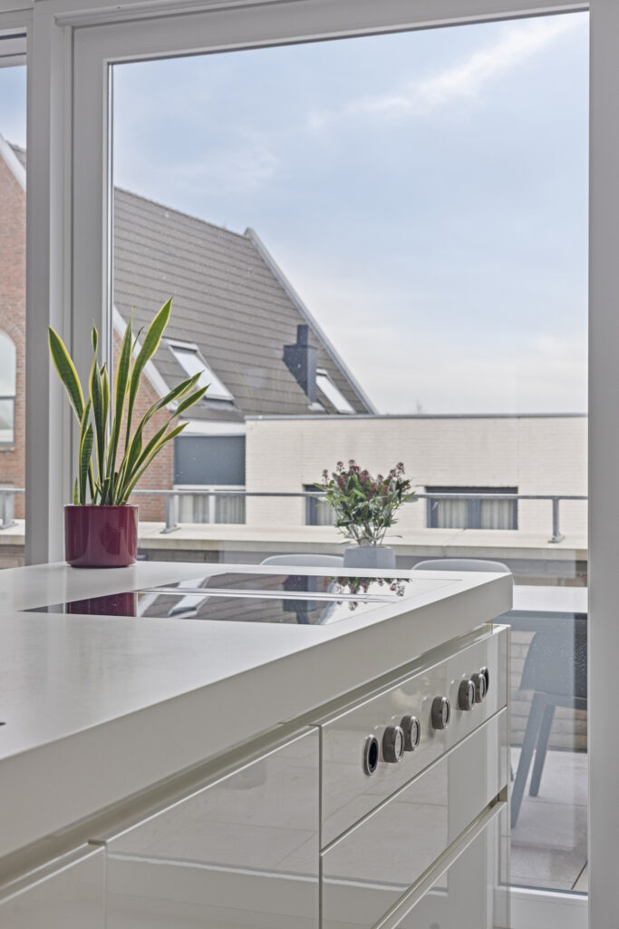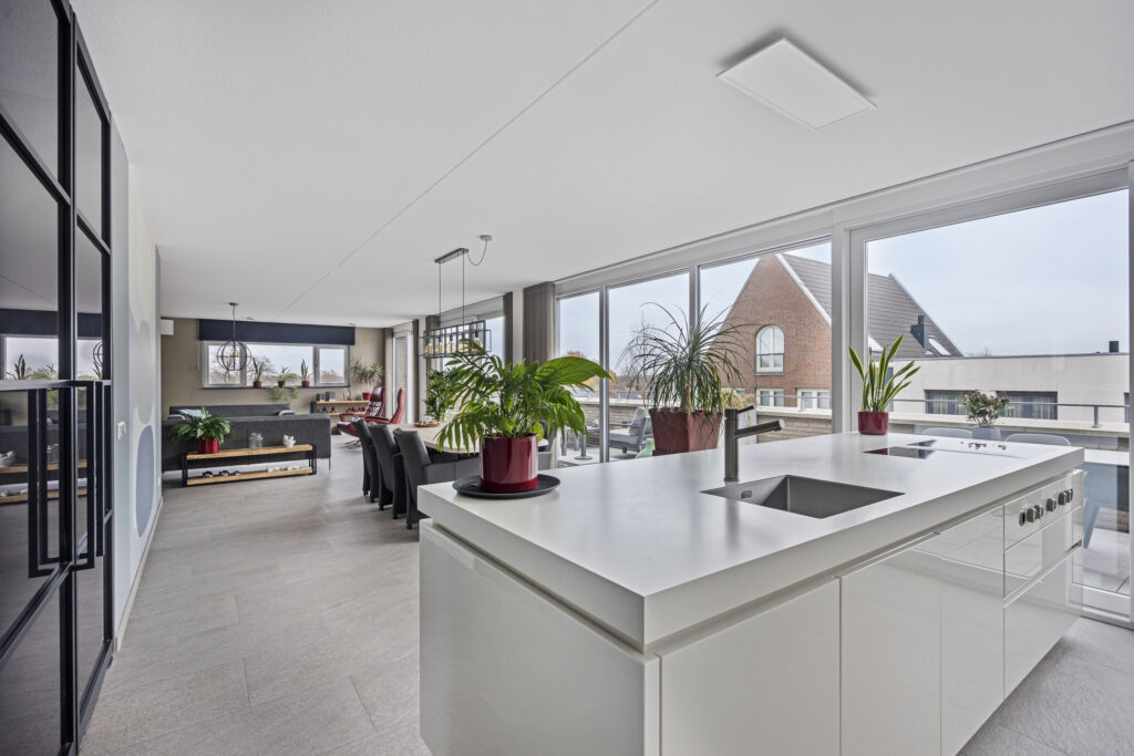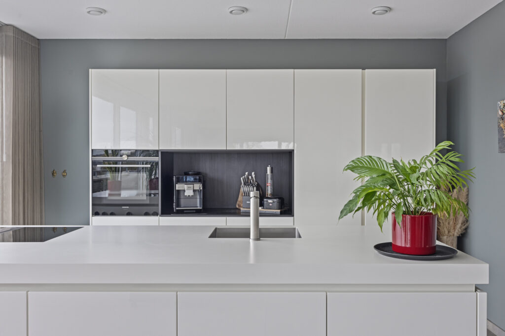 Voor de kookliefhebber die geen concessies wil doen ten aanzien van luxe en comfort, heeft dit penthouse de perfecte keuken. Het grote kook-/spoeleiland, uitgevoerd in het wit, en de grote kastenwand vormen een fraai geheel. Er is een koffiecorner gemaakt en alle A-kwaliteit apparatuur is ingebouwd: een inductie kookplaat met afzuiging, een vaatwasser, koel-/vriescombinatie en een combi-oven.
