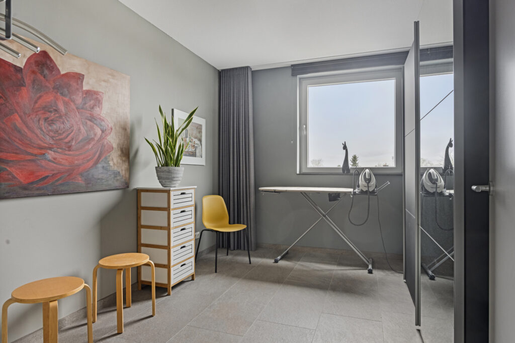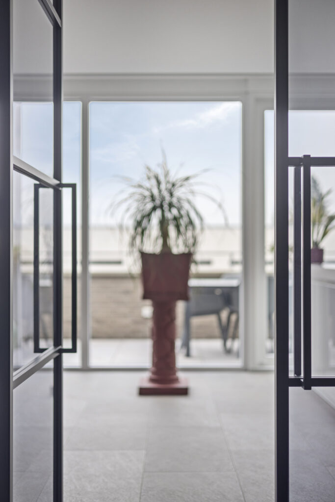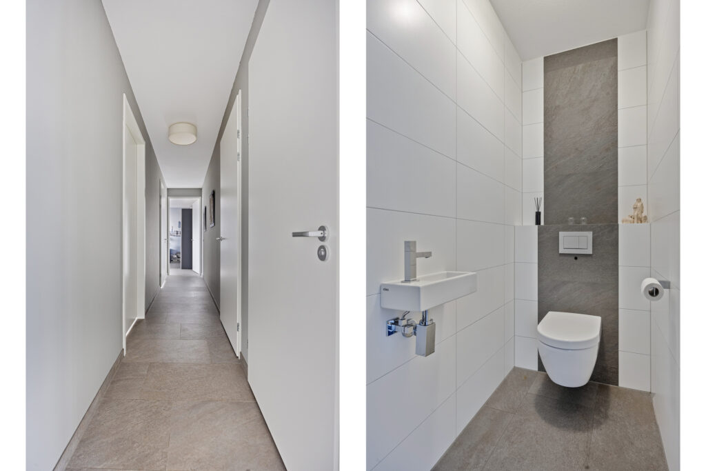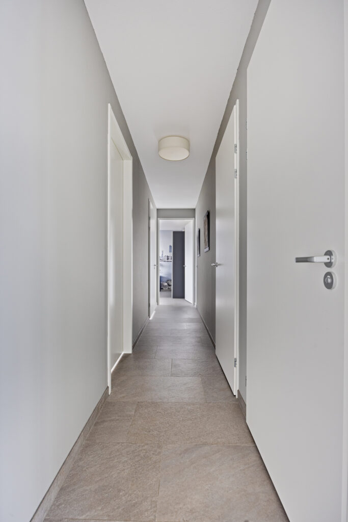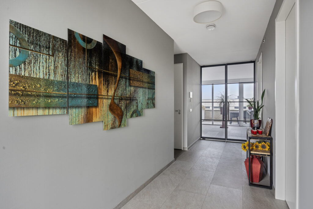 De ontvangsthal heeft, net als de rest van het penthouse, een zeer royale opzet. U ziet stucwerk, ingetogen kleurgebruik en een prachtige tegelvloer met laagtemperatuur vloerverwarming. Aan de hal grenzen alle ruimtes van het penthouse, waaronder het fraaie gastentoilet met fonteintje en twee bergingen. Een van de bergingen is ingericht als wasruimte en in de andere berging is ruimte voor een vriezer en andere spullen.