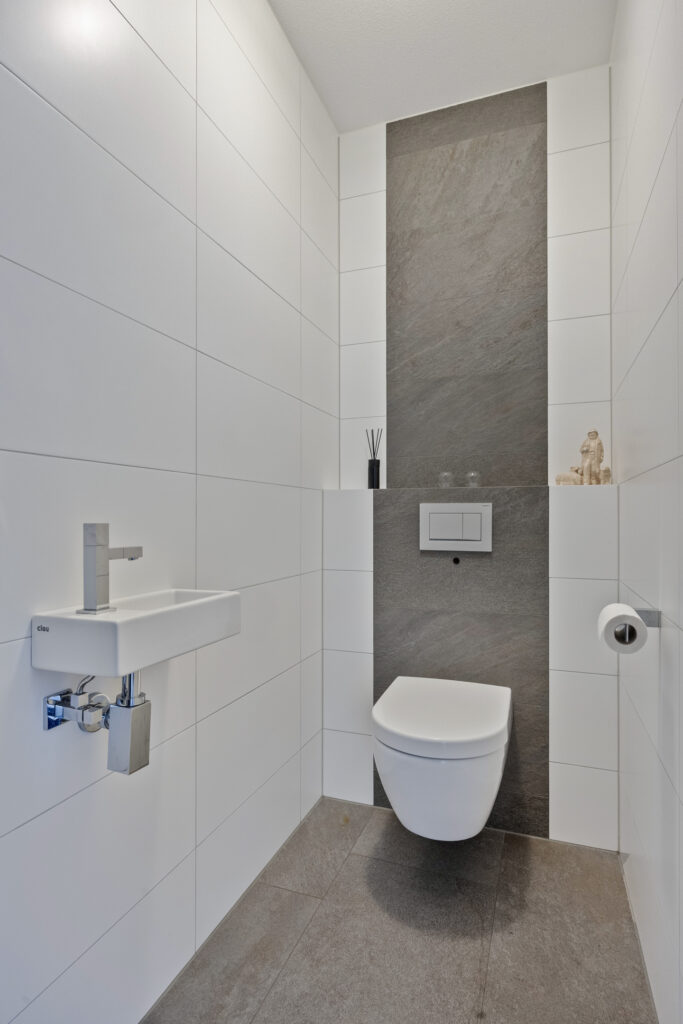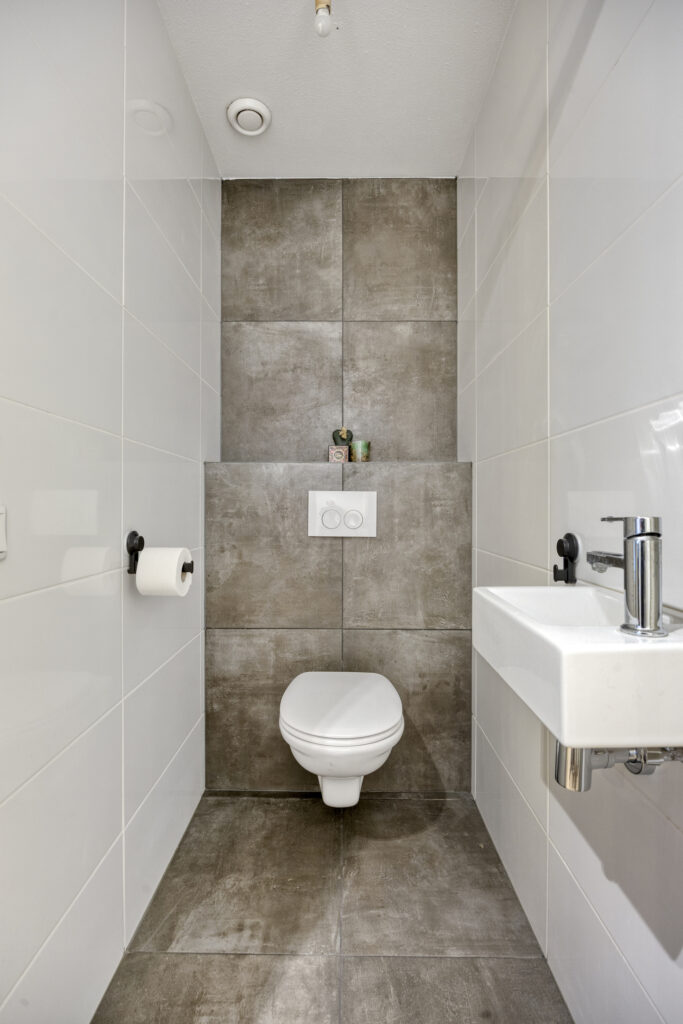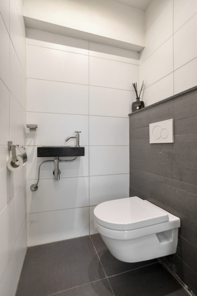 Ook de badkamer en separate toiletruimte met fonteintje zijn vanuit de hal te bereiken. Je ziet lichte wand- en vloertegels, net sanitair en zwarte accenten. De badkamer is ingedeeld met een douche, een grote douchekop met thermostaatkraan, een wastafelmeubel met tweedeurs kast en een spiegelkast.