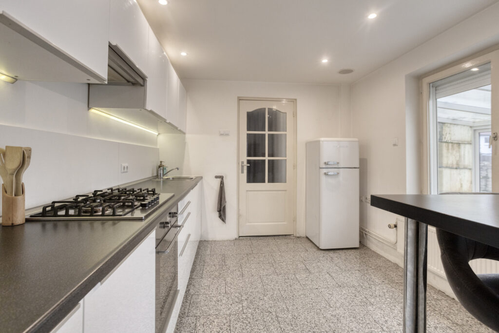 Naast de woonkamer bevindt zich de dichte keuken, waar een mooie wandopstelling met houtpatroon staat. De lades en kasten bieden veel bergruimte en de gaskookplaat, afzuigkap, vaatwasser, combi-oven/magnetron en koelkast zijn ingebouwd. Het plafond is voorzien van inbouwverlichting en de wand boven het aanrecht is deels betegeld. Naast de keuken is de bijkeuken met een inbouwkast, de opstelling van de HR-ketel en de wasapparatuur.