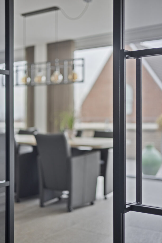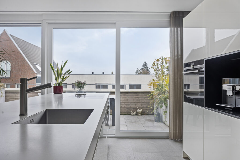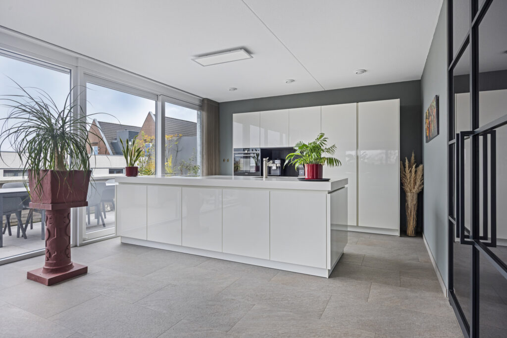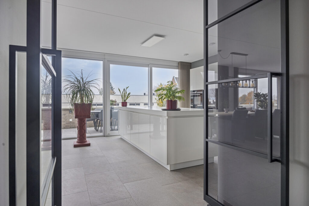 Twee prachtige zwarte taatsdeuren met glas verbinden de hal met de woonkamer die, inclusief keuken, ruim 70 m² groot is. Met een lengte van 14.50 meter en maar liefst 3 schuifpuien naar het dakterras is dit een fantastische leefruimte, met mooi lichtinval en een airco-unit voor aangename koeling. Door het brede raam bij het zitgedeelte heeft u prachtig uitzicht over dit mooie stukje Echt, met vele boomtoppen in het gezichtsveld.