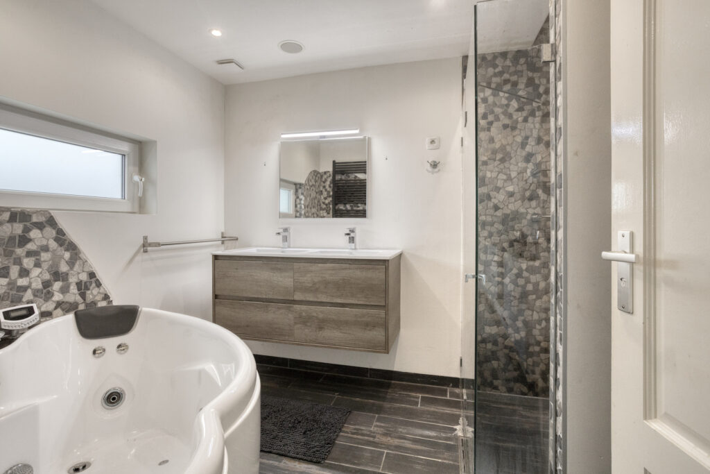 Blikvanger in de badkamer is het duo whirlpoolbad, dat garant staat voor een stukje rust en wellness in huis. Verder zijn er een inloopdouche met glazen deur, een kast met de HR-ketel en een badmeubel met twee wastafels.