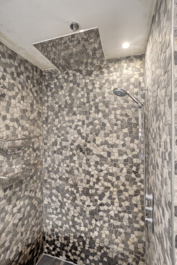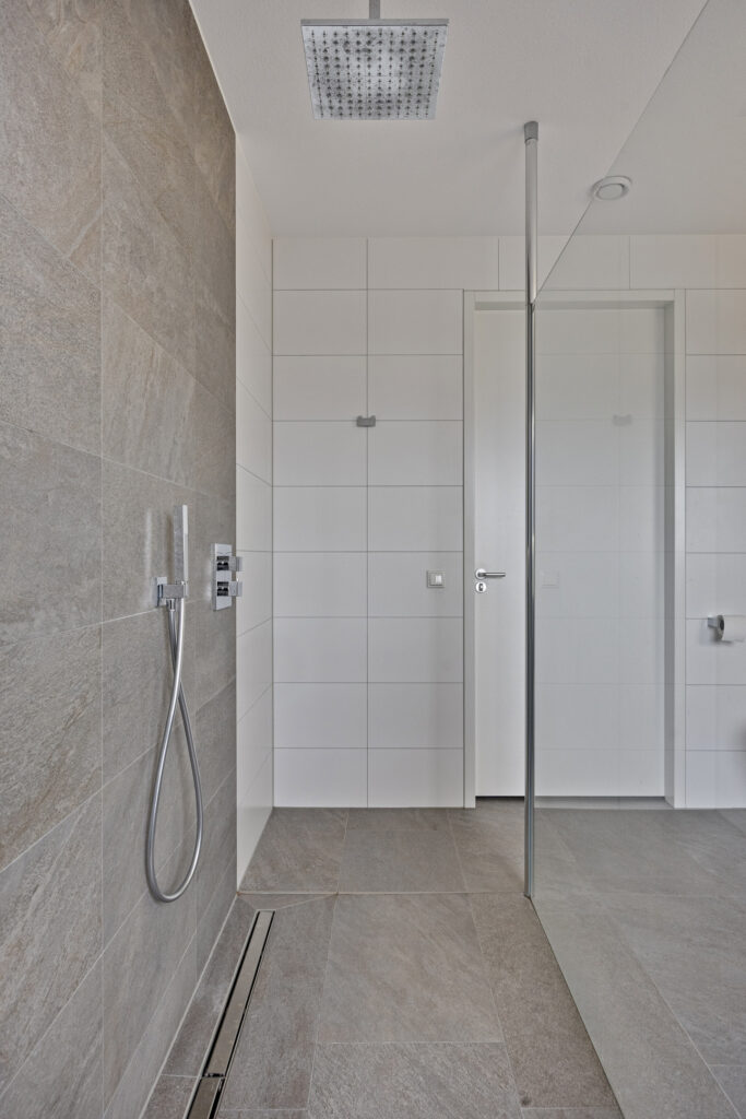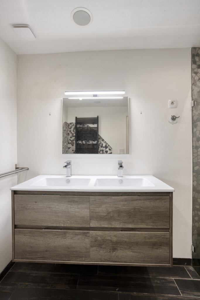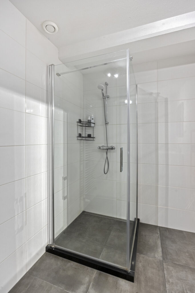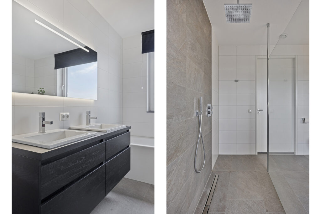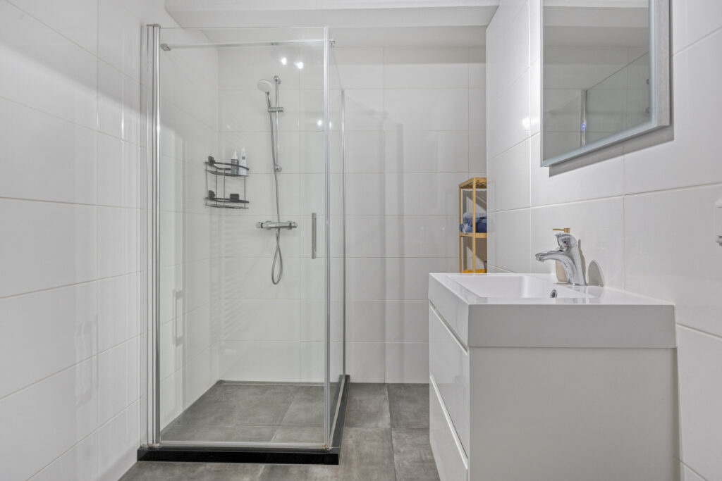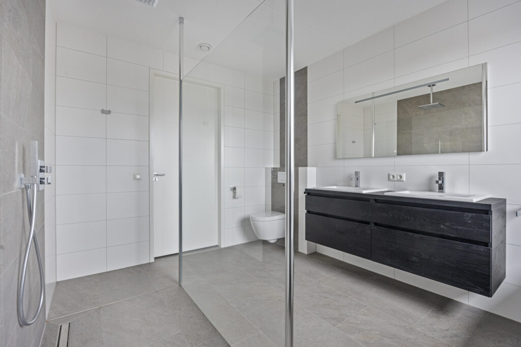 De badkamer is, net als de toiletruimte, uitgevoerd met grote wand- en vloertegels. In de badkamer zie je een wastafel met onderkast, een spiegel met verlichting en de douche is uitgevoerd met een regendouche en een losse handdouche.