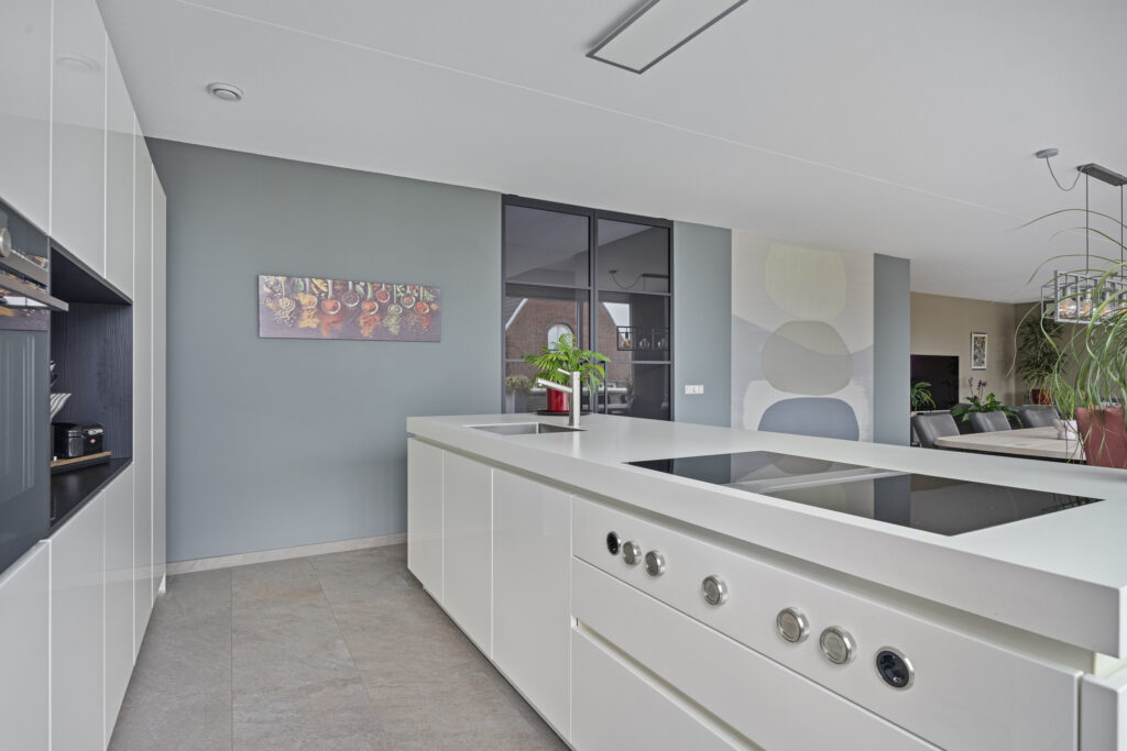 De keuken is een fraaie, grote ruimte met lichtinval vanaf twee kanten. Je oog valt op de moderne wandopstelling met een ingebouwde inductie kookplaat, afzuigkap, combi-oven, vaatwasser en een koel-/vriescombinatie. Extra bergruimte is er in de bijkeuken/berging, waar ook de wasmachine en droger kunnen staan.