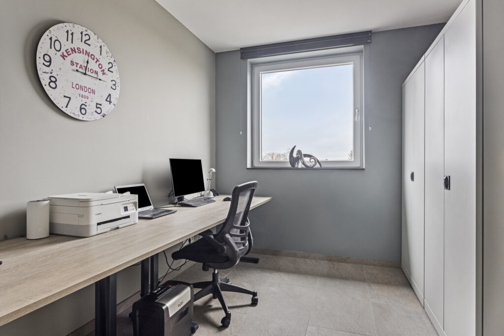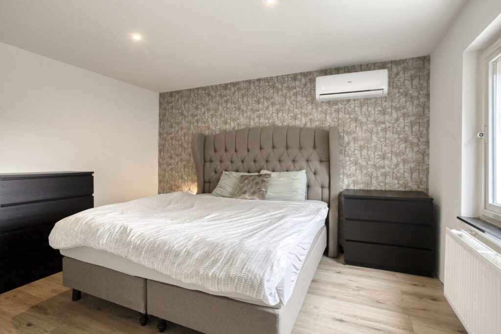 Niet alleen de overloop, maar ook de slaapkamers zijn heel ruim en licht. Er zijn twee slaapkamers aan de voorzijde, die nagenoeg even groot zijn, en de master bedroom vind je aan de achterzijde. Er ligt laminaat op de vloer, de wanden zijn gestuct en in de master bedroom hangt een airco-unit (koelen en verwarmen).