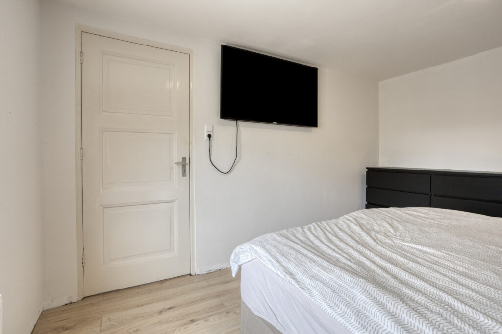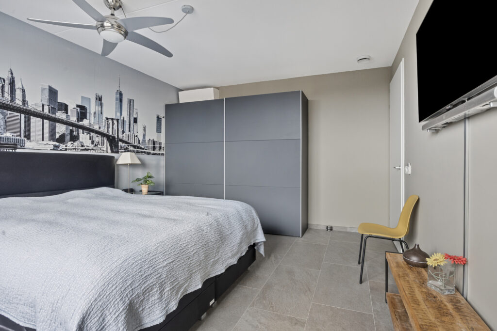 Aan de achterzijde, met uitzicht naar een breed plantsoen, zijn de slaapkamers gesitueerd. De hoofdslaapkamer met inbouwkast grenst aan een balkon en de tweede slaapkamer is thans ingericht als berging/kleedruimte. In beide slaapkamers ligt een grijze laminaatvloer.