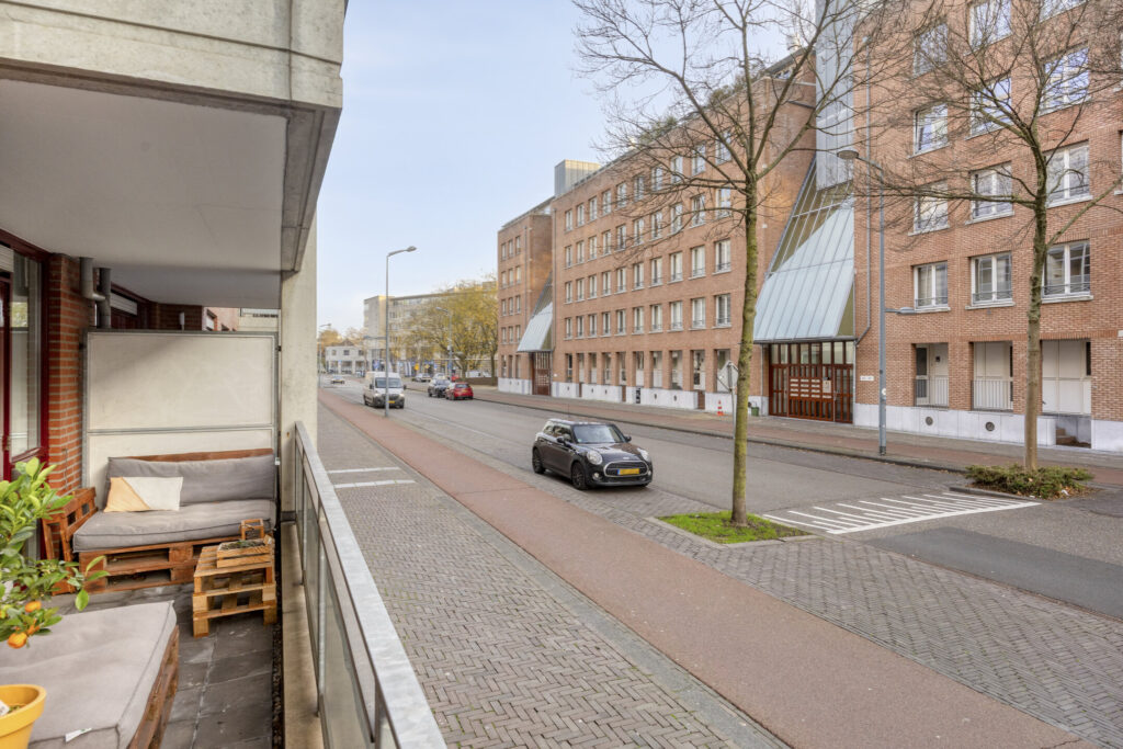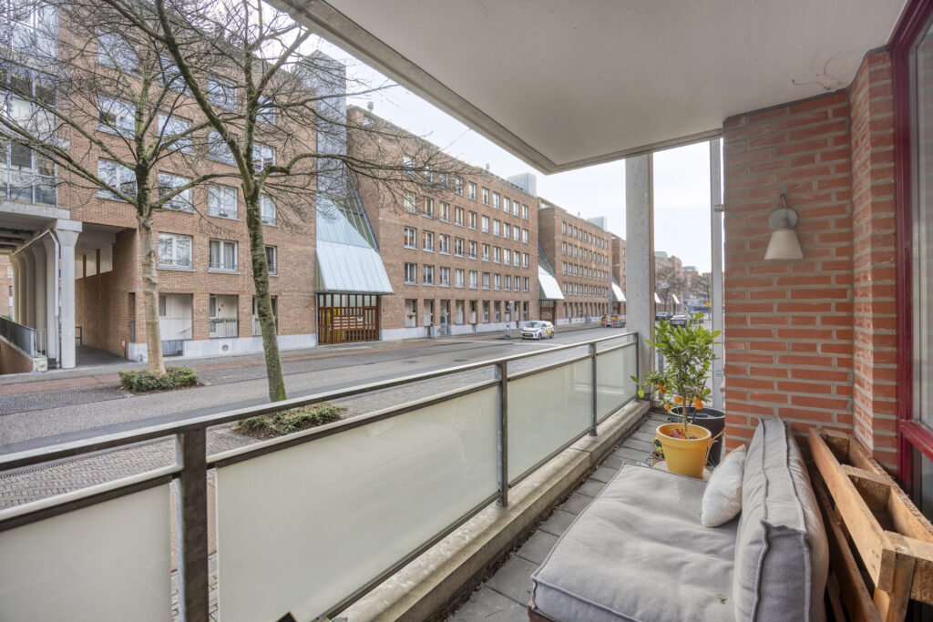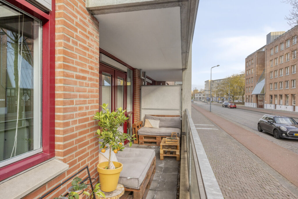 Dit appartement heeft niet een, maar twee balkons. Vanuit de slaapkamers is het balkon aan de achterzijde te bereiken, gesitueerd op het zuidwesten. Het uitzicht naar het plantsoen met bomen is fraai en dankzij de ligging op de bovenste verdieping is er volop zon. Aan de voorzijde is het tweede balkon, dat grenst aan de keuken.
