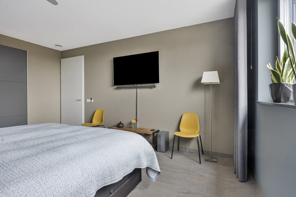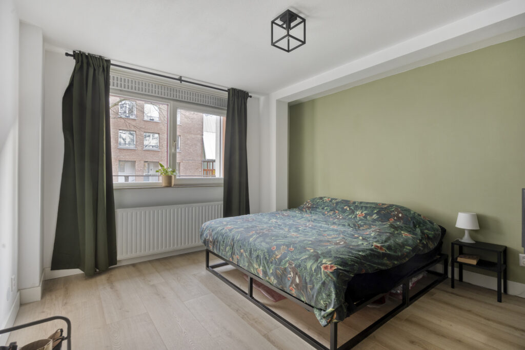 Het rechterdeel van het appartement biedt ruimte aan twee royale slaapkamers, de badkamer en een aparte toiletruimte. Zowel de toiletruimte als de badkamer is vernieuwd, met grote wand-/vloertegels en modern sanitair. In de badkamer heb je de beschikking over een royale douche met glazen wand, een wastafelmeubel en een spiegel met verlichting.