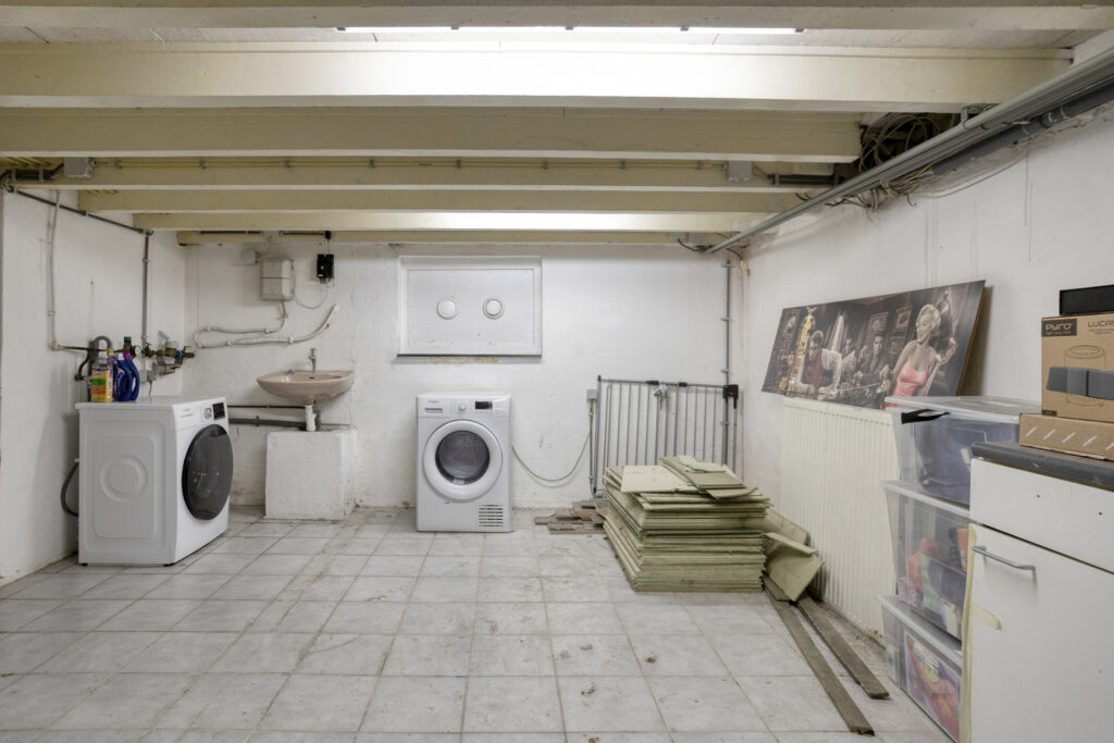 Voor we naar buiten gaan, even naar de kelder. In totaal zijn er drie ruimtes, waarvan een met de opstelling van de wasapparatuur. Zo is de kelder niet alleen geschikt als opslag, maar ook als was- en strijkruimte. En dan is er ook nog plek voor een werkbank, wandrekken en nog meer …