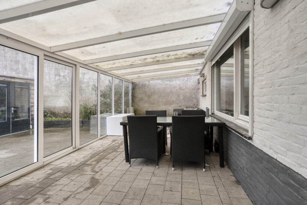 Vanuit de hal is er toegang tot een circa 25 m2 grote overkapping/serre, met een schuifpui naar de tuin. De overkapping biedt een fijne plek om droog en beschut te zitten, terwijl de tuin volop zon biedt. De berging met dubbele deuren is een prima plek voor de fietsen, de werkbank en je collectie gereedschap. En parkeren? Dat kan op eigen terrein!