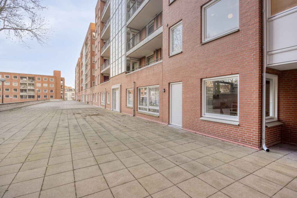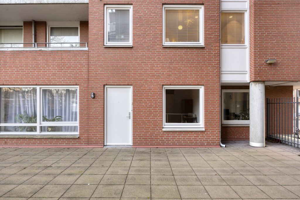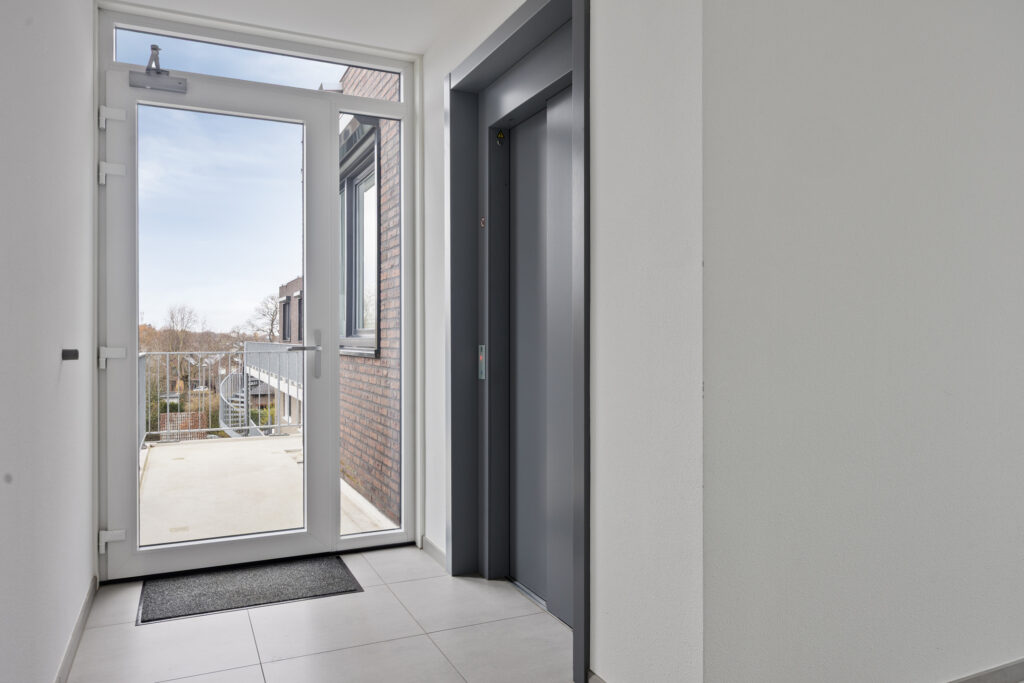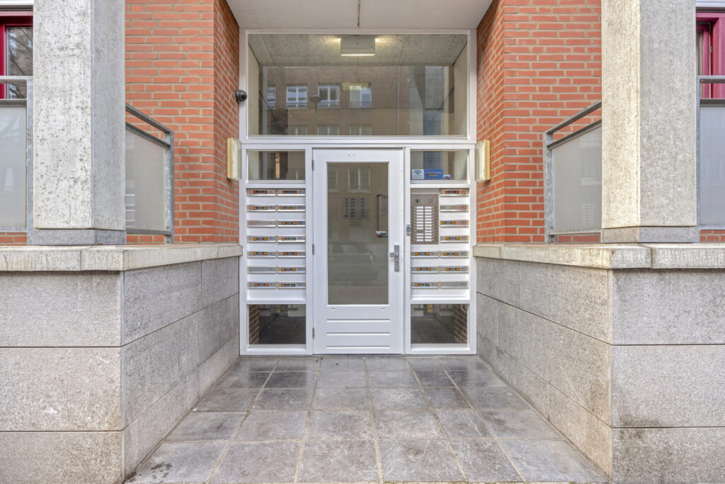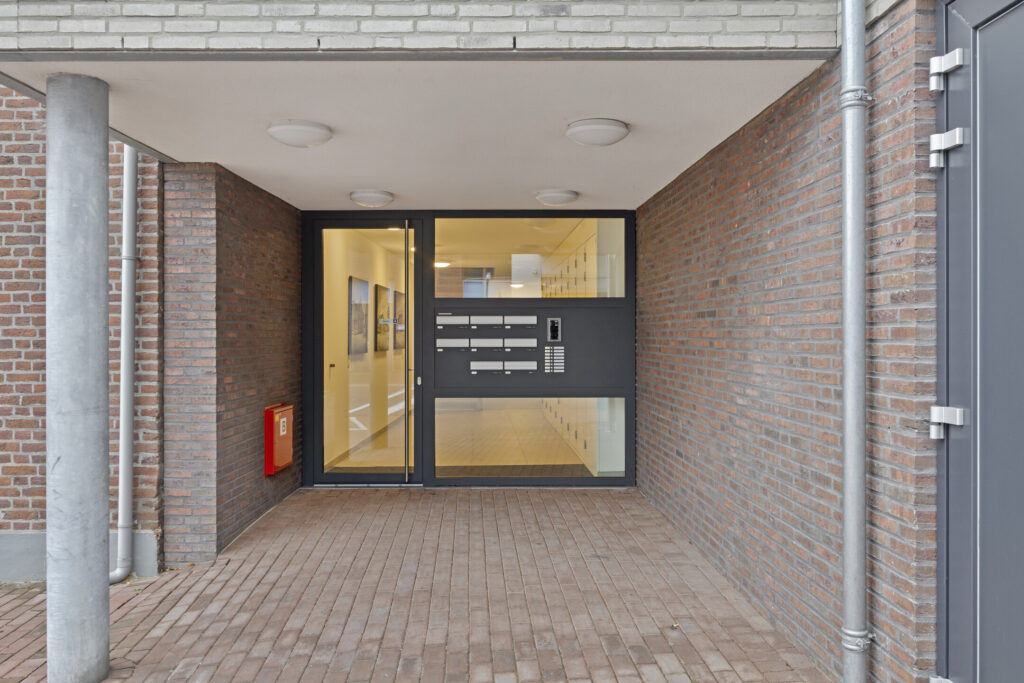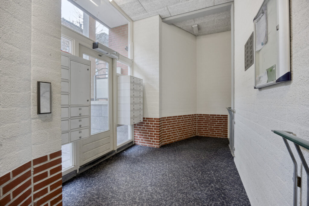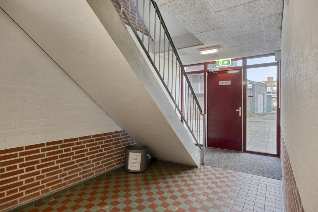 Het gebouw heeft een goed onderhouden centrale entree met de video-intercom, brievenbussen en het bellentableau. De ruime privéberging bevindt zich op de begane grond en met de trap is het appartement, gesitueerd op de bovenste verdieping, te bereiken. Wonen op de bovenste verdieping heeft meerdere voordelen: je woont rustig, het uitzicht is fraai en doordat de bomen lager zijn is er veel lichtinval in het appartement.