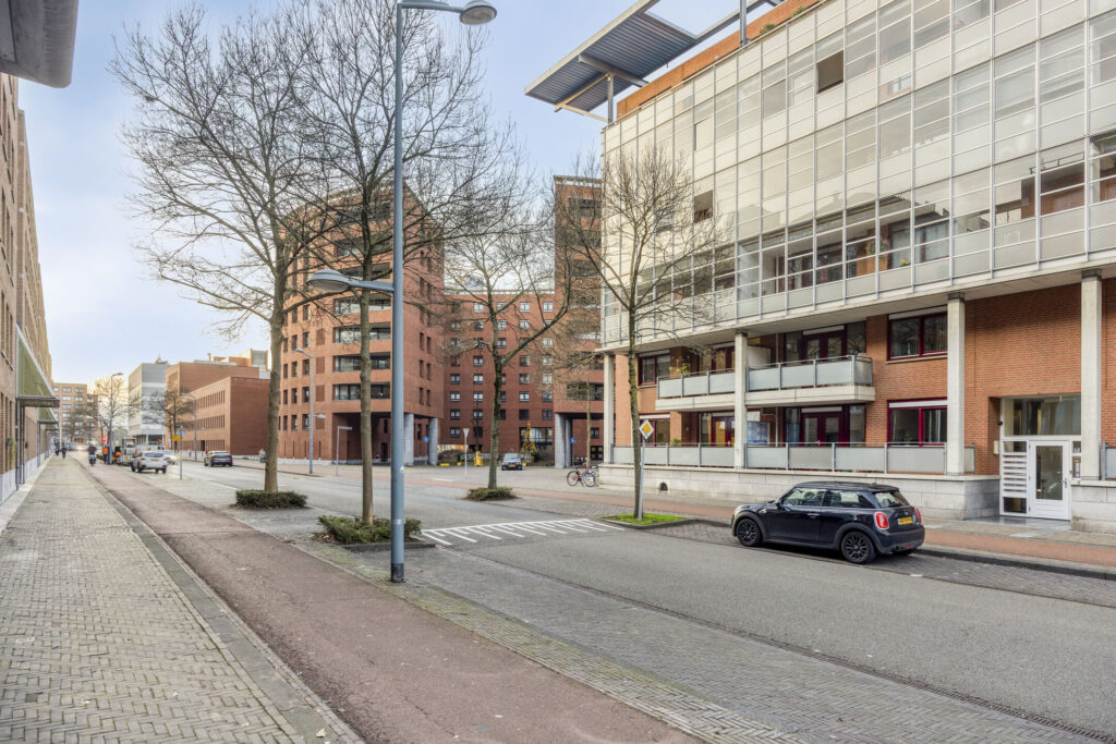 Vanaf de parkeerplaatsen langs de Zeepziedersdreef loop je naar de centrale entree van huisnummer 10A – 12A. Aan de buitenzijde zijn de brievenbussen en het bellentableau met video-intercom, waardoor niet iedereen zo naar binnen kan lopen. Vervolgens kun je met de trap de ruime berging in het souterrain en het appartement, op de tweede woonlaag, bereiken.