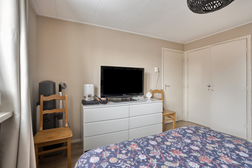 Niet alleen de overloop, maar ook de slaapkamers zijn heel ruim en licht. Er zijn twee slaapkamers aan de voorzijde, die nagenoeg even groot zijn, en de master bedroom vind je aan de achterzijde. Er ligt laminaat op de vloer, de wanden zijn gestuct en in de master bedroom hangt een airco-unit (koelen en verwarmen).